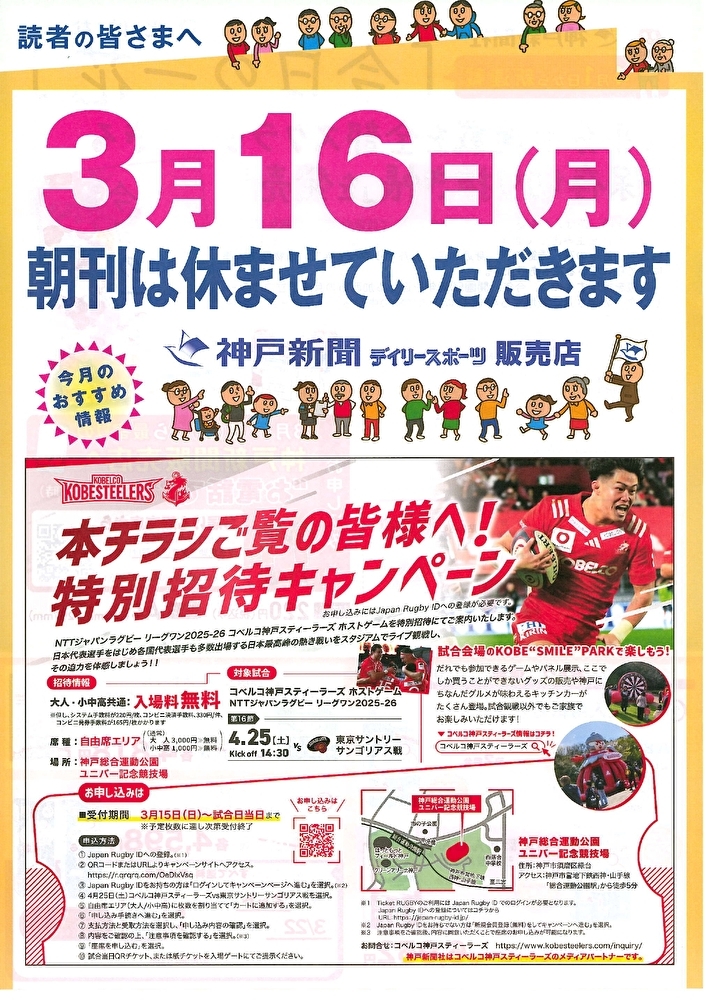 3月16日(月)の朝刊はお休みさせていただきます。