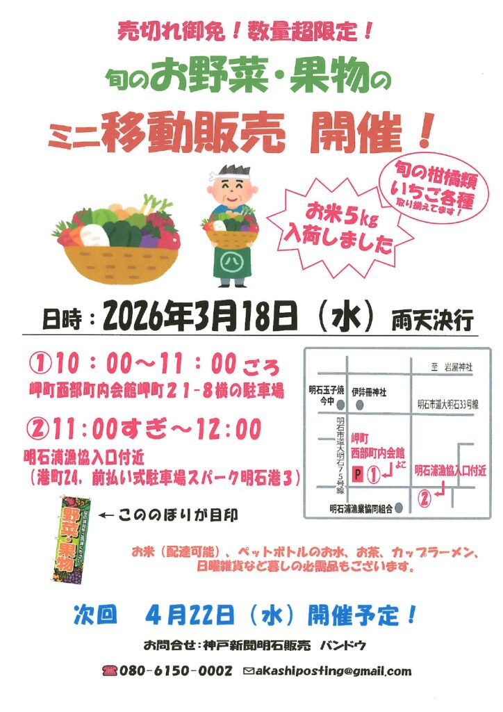 野菜果物のミニ移動販売 開催! 投稿日 2026年3月17日 著者 newspaper-sales カテゴリー 新着情報 昨年末からスタートしました「野菜果物のミニ移動販売」も今回で4回目!今月は2ヶ所で開催します。旬のお野菜・果物、暮らしの必需品あれこれご用意。ご来店お待ちしております!