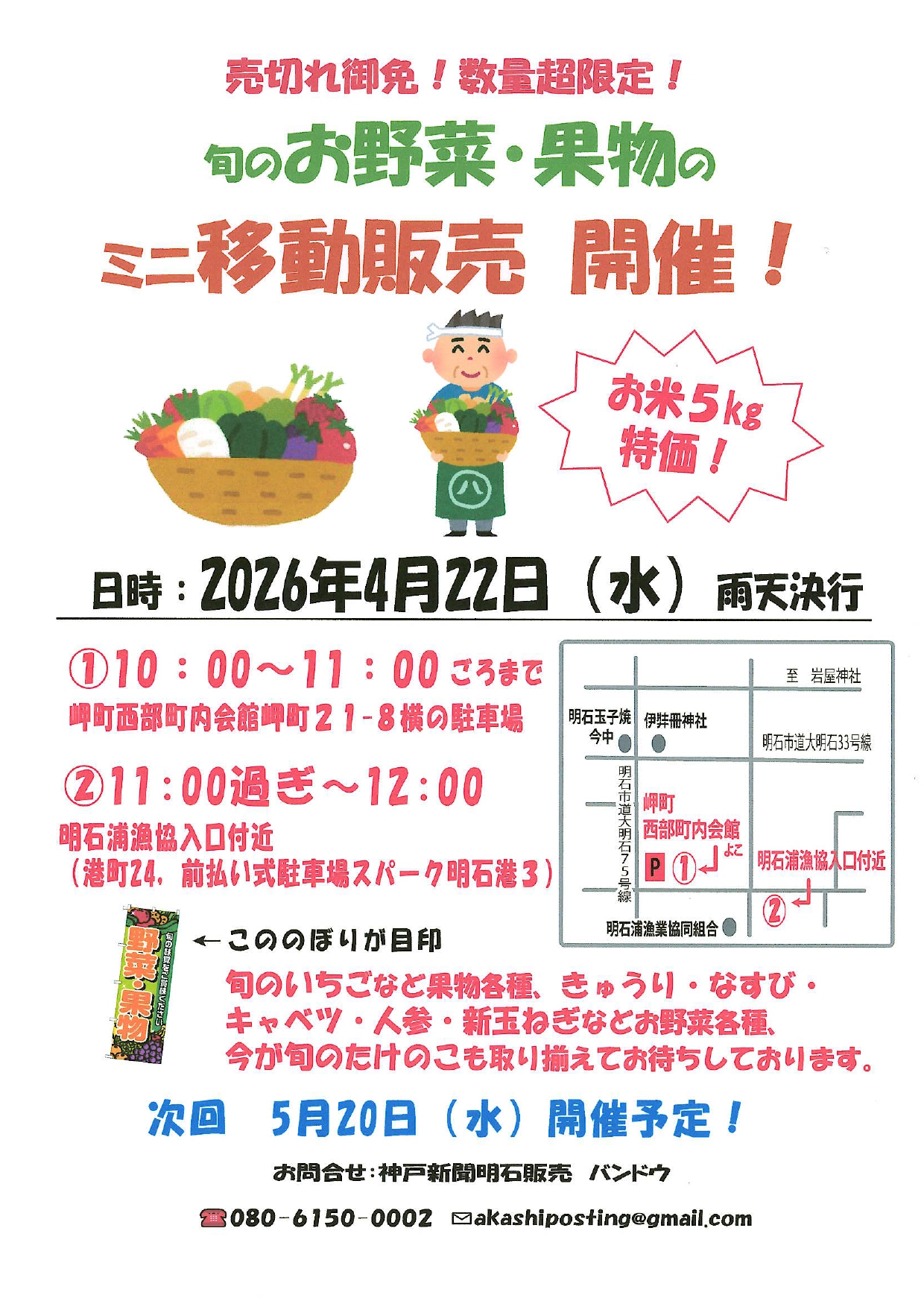 4月野菜果物のミニ移動販売 開催! 投稿日 2026年4月21日 著者 newspaper-sales カテゴリー 新着情報 今月も明日「野菜果物のミニ移動販売」を開催いたします。今が旬のたけのこをはじめ、その他お野菜・果物等あれこれご用意。ご来店お待ちしております!